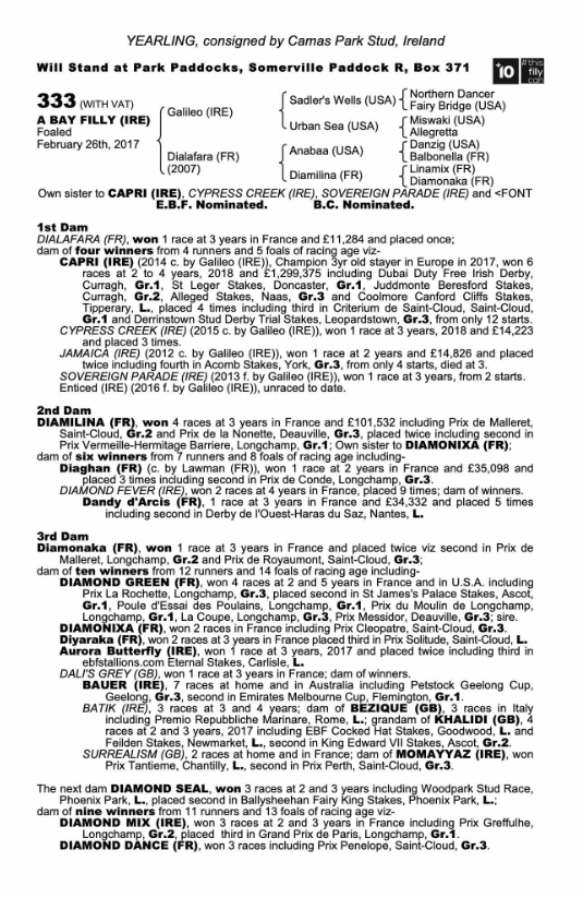 The Aidan O’Brien-trained PASSION became the 178th winner of a Tattersalls October £25,000 Book 1 Bonus when a convincing winner of the EBF Fillies Maiden at Cork this afternoon. The regally bred daughter of GALILEO is an own sister to the Group 1 Irish Derby and Group 1 St Leger winner CAPRI and earned a total of 45,637 euros for her owners Mrs John Magnier, Michael Tabor and Derrick Smith. Camas Park Stud offered the daughter of the ANABAA mare DIALAFARA at Book 1 of the Tattersalls October Yearling Sale where she was purchased by SackvilleDonald for 800,000 guineas.